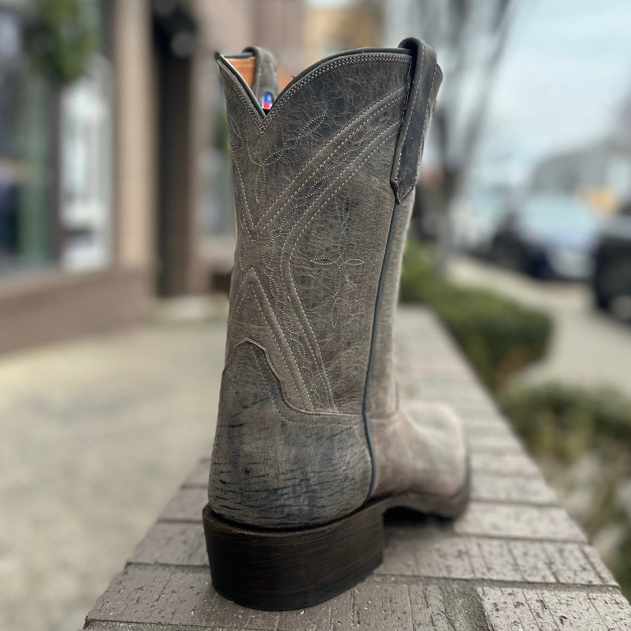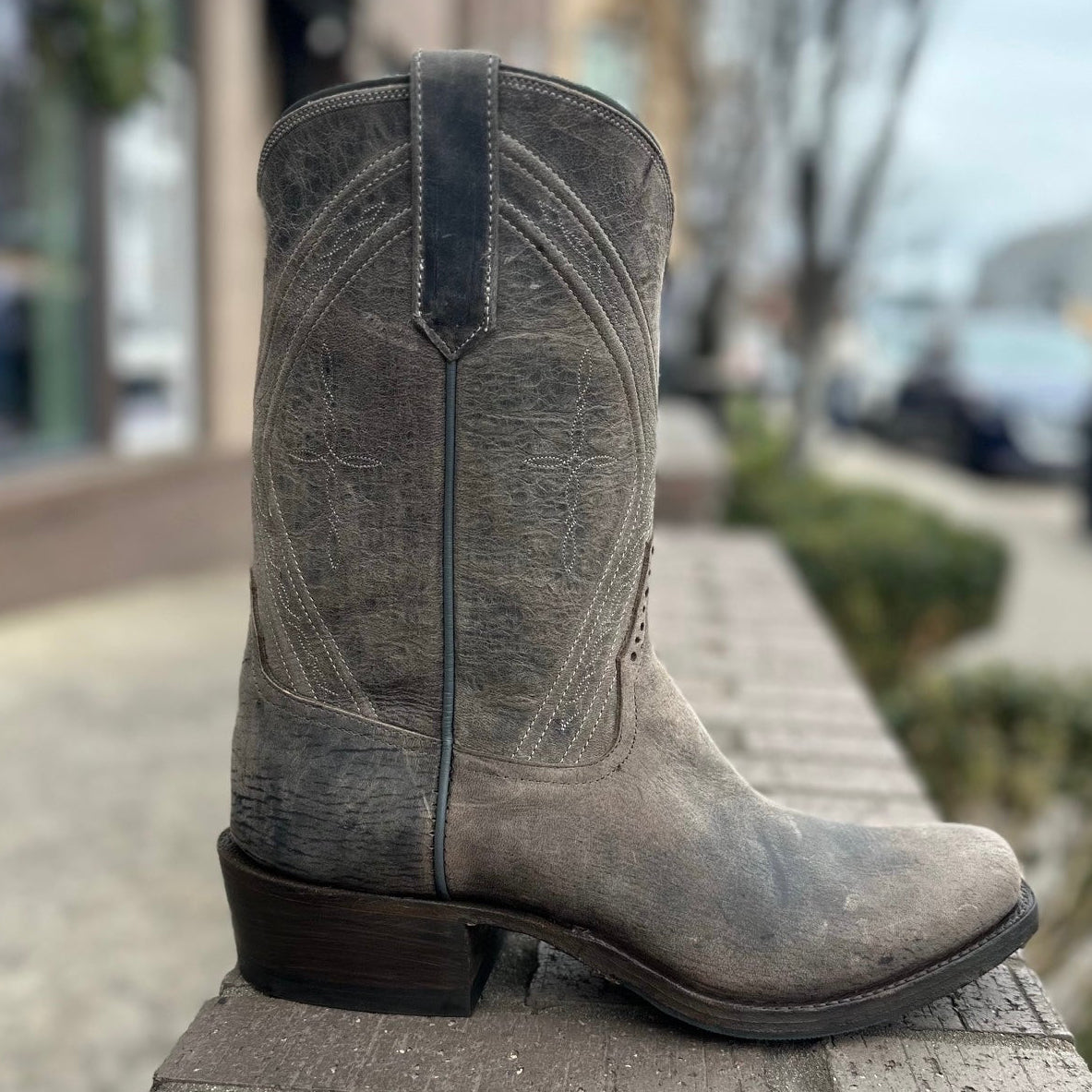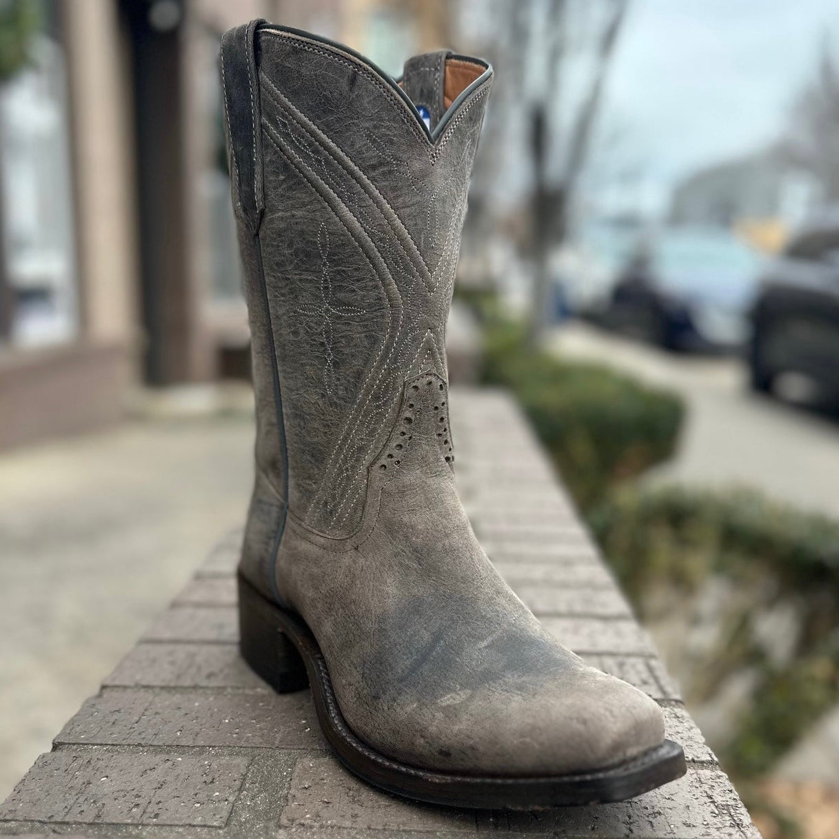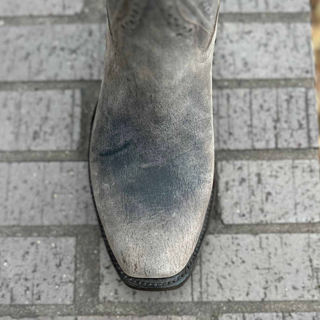 This unique boot combines the roper height with the Kutter toe by Rios of Mercedes. The leather is weathered and durable for a cool distressed look.