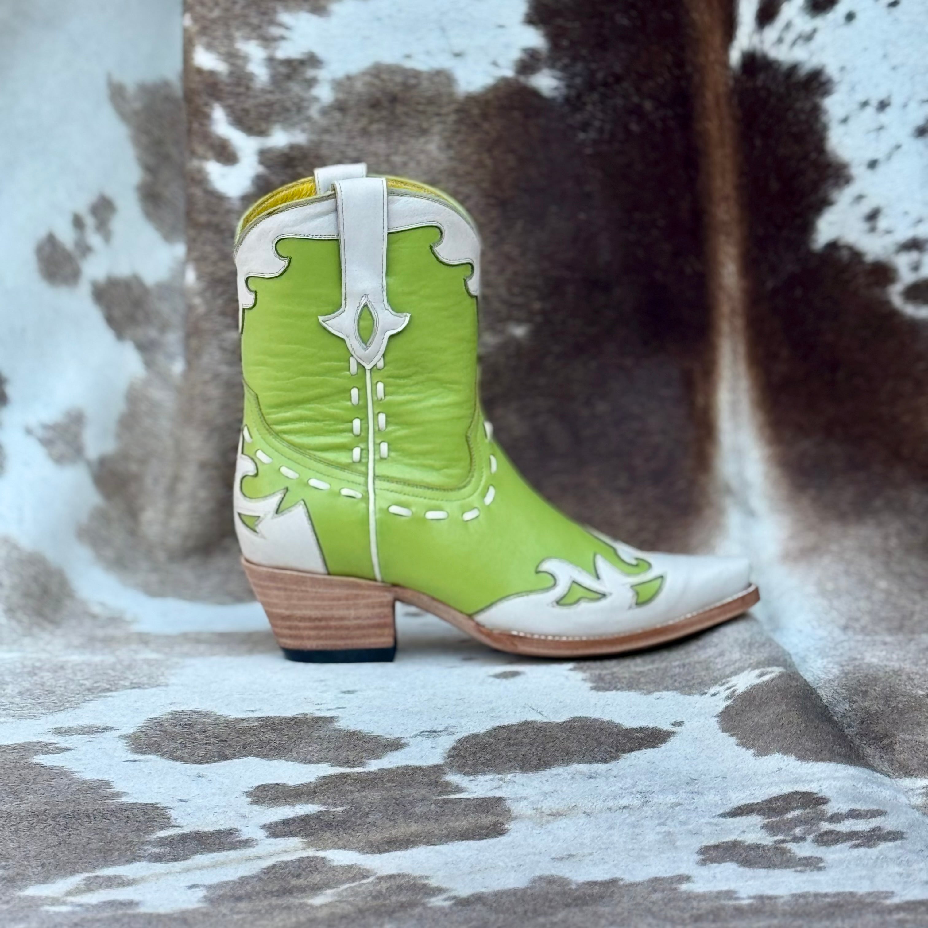 Planet Cowboy's newest edition of handmade Cowgirl boots from our 50’s inspired Wingtip Collection! A sexy lil’ combination of lime  and white- a perfect shortie peewee boot to dress up or down!